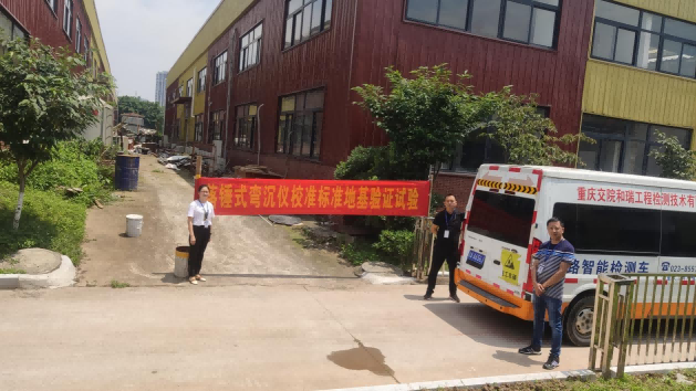 结合重庆市公路学会交通工程监理及检测专委会通知要求(下简称专委会),我单位喜获成为《落锤式弯沉仪标准地基性能试验》测试基地参测单位,单位对专委会安排的测试任务十分重视,由公司党支部书记/检测工程师曹洪建同志、副总经理/质量负责人周维彬、质量技术部部长/检测工程师张红等同志组建了专业测试小组,按照计量校准作业指导书要求:荷载70kN,落锤弯沉仪中心弯沉值不大于300μm的混凝土路面,通过设计铺设不同种类的材料使弯沉值达到300μm,对不同厚度材料进行试验,测试小组对测试数据选点、温度代表性有效选择作了精心准备,经过10天的测试周期,顺利完成了采集记录数据,完成了测试任务。